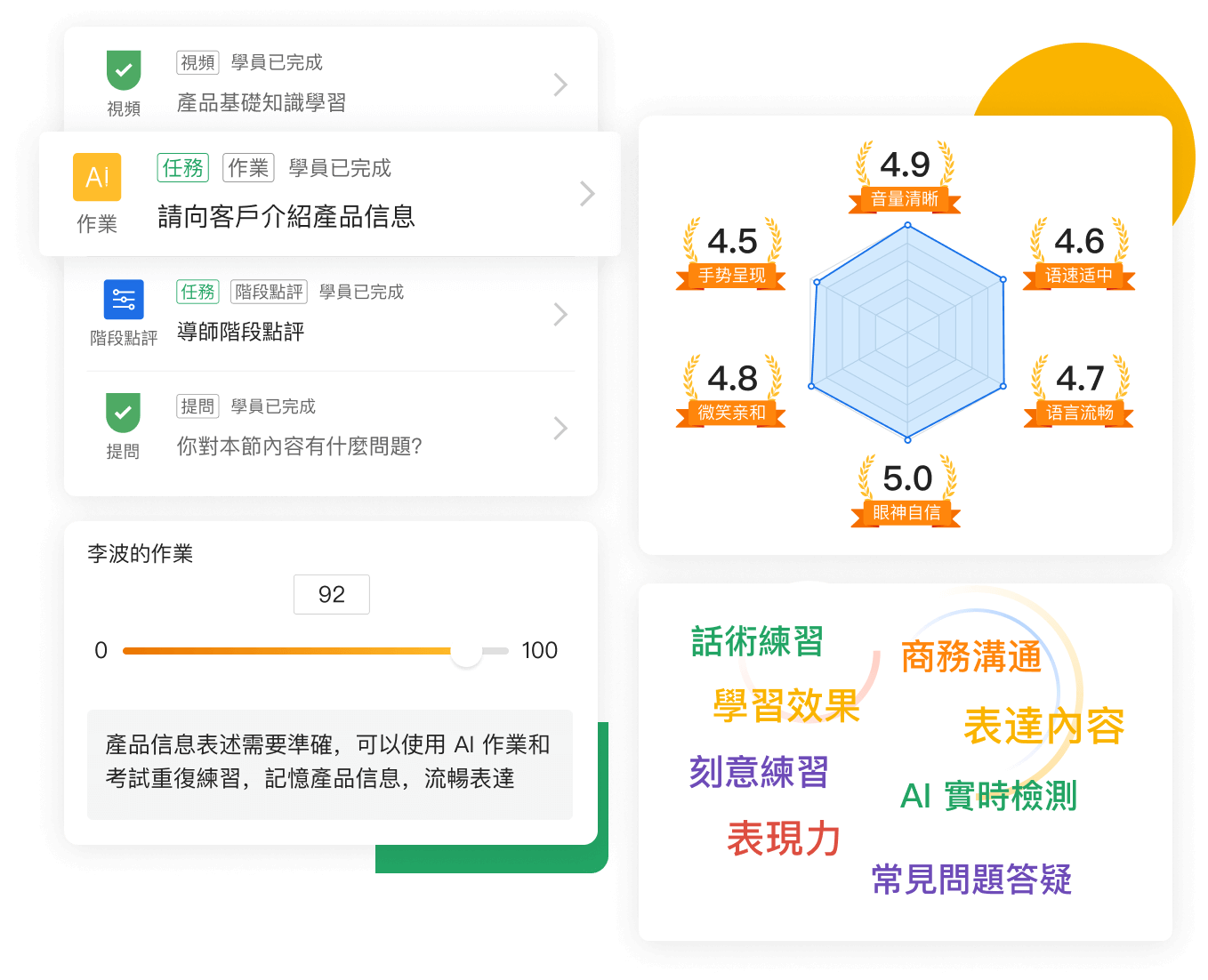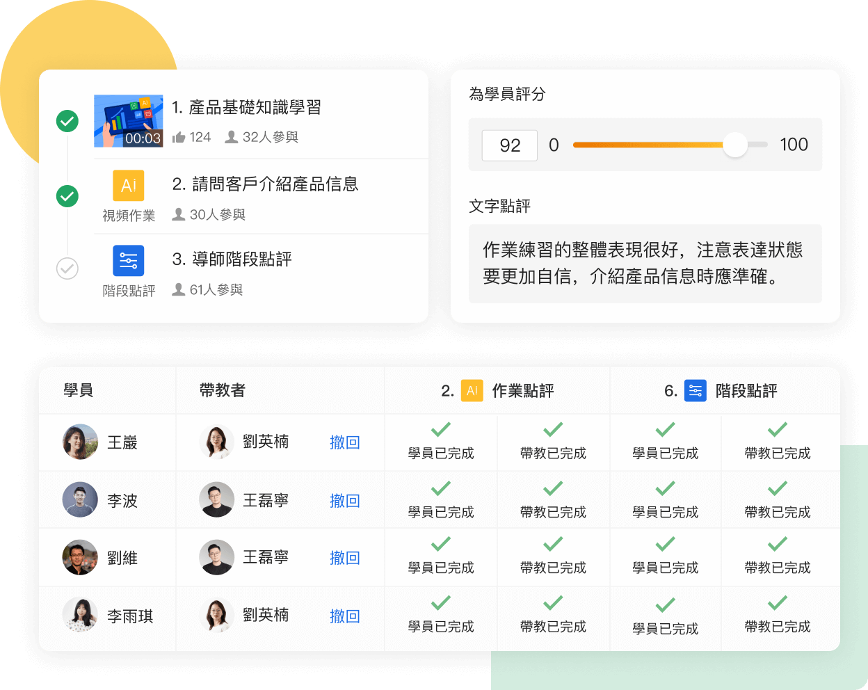 用作業點評、階段點評等輔導工具,結合 UMU AI 訓練,在工作中記錄學員表現、給予輔導反饋,幫助員工快速勝任工作。