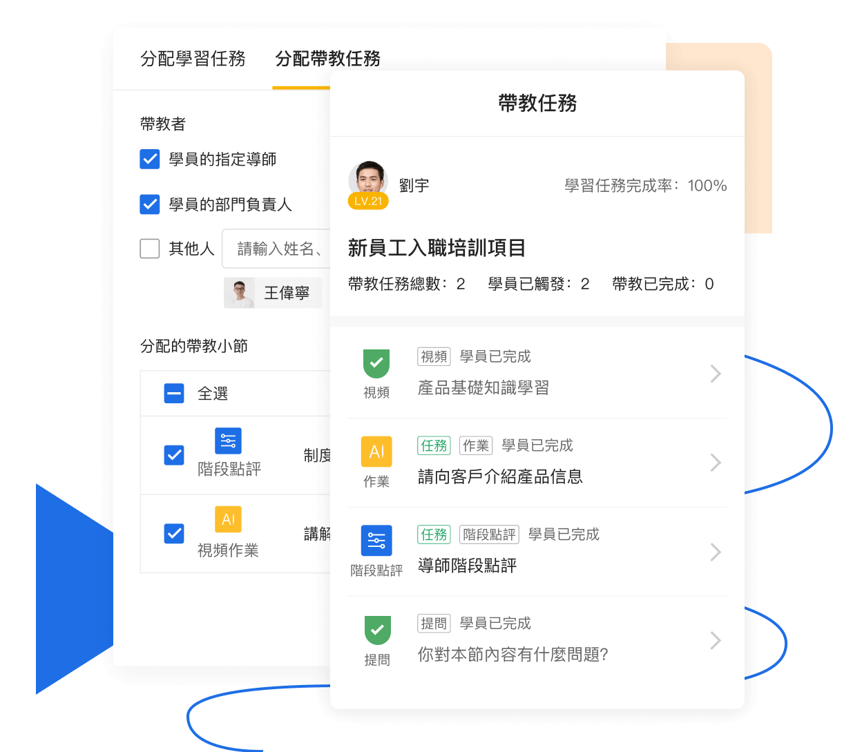 從員工學習、作業練習,到導師打分點評,OJT 課程為員工提供遊戲化闖關學習體驗,獲取個性化練習反饋,實現學以致用。